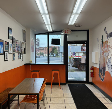 As you step inside, you are met with an informal space that feels similar to a fast-food chain. But with a closer look, it becomes clear that Nanabi is anything but ordinary. The space is decorated in orange—from the walls to the chairs to even the trays. The place is small, with only one table and a narrow counter overlooking the street, accompanied by a couple of stools. One wall is covered with various modern paintings, such as abstract ghosts and nature. Another wall is completely covered in cute bubble tea drawings in an anime-cartoon–style along with cartoons of a dog, hearts and a baby angel. The inside of Nanabi clearly reflects not just a commitment to good food, but also to a creative and sweet artistic experience.